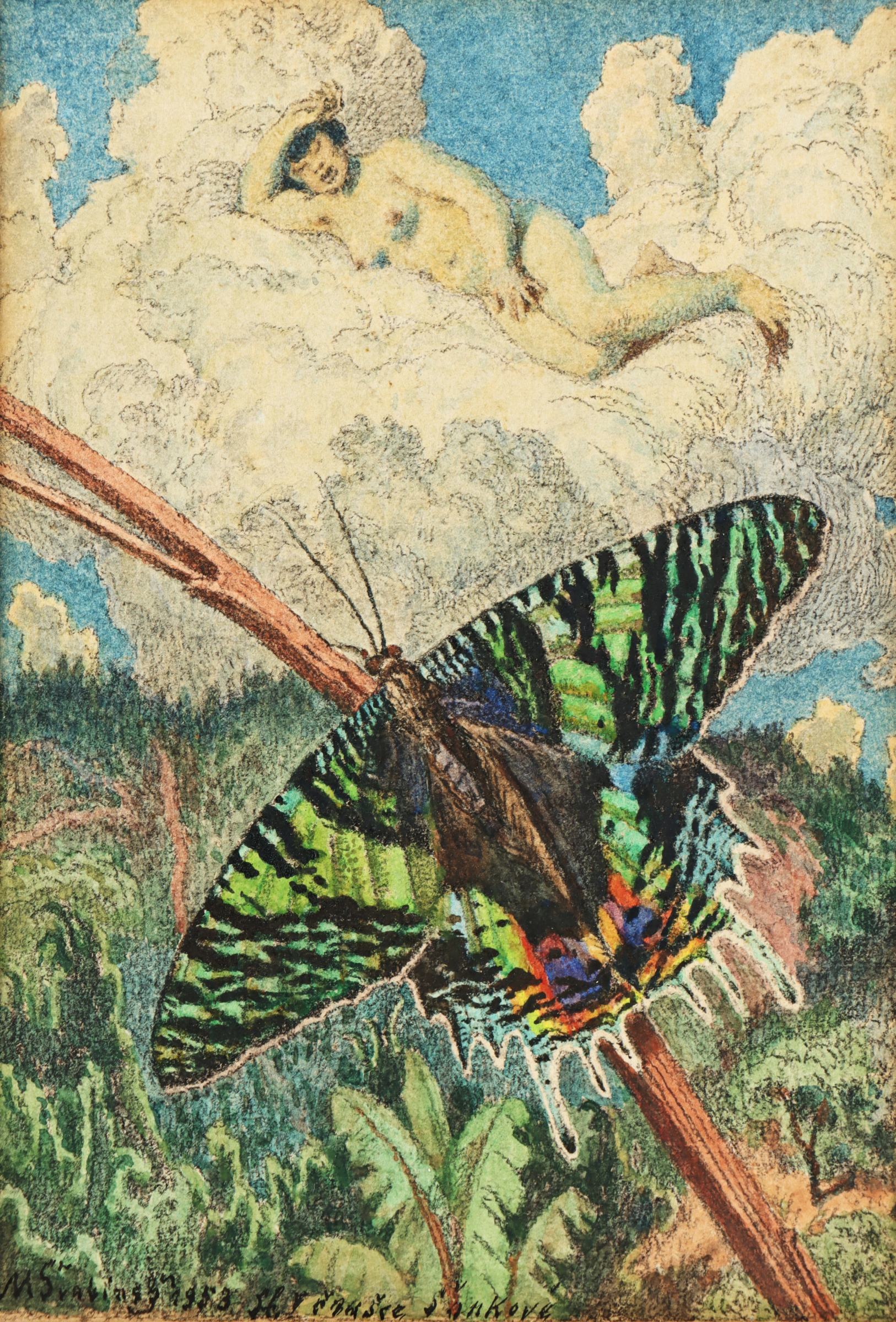 Motýl, rok 1953, pastel, úhel na papíře, signováno a datováno vlevo dole s věnováním M. Švabinský 1953, na rubu přípis, rozměry kresby 23 x 16 cm, celkové rozměry s rámem 46 x 35 cm.