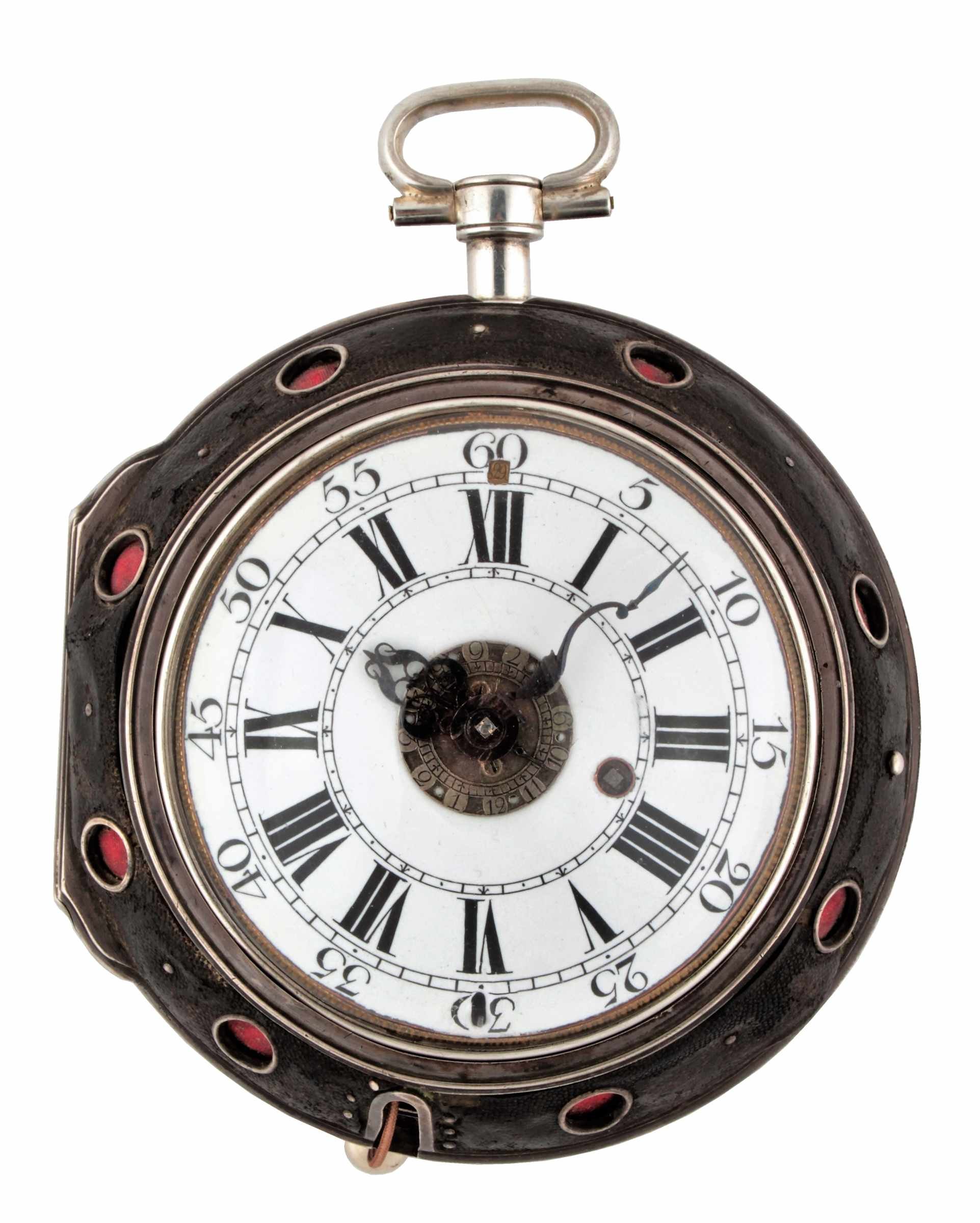 Germany, Friedberg, Joseph Spiegel (Joseph Miroir), circa 1740. Large double-cased traveling striking clock with date display and alarm. The outer silver case is decorated with pierced circular openings, studs, and covered with dark brown snakeskin. The inner silver case is engraved and richly pierced with foliate scroll ornament. Verge movement with circular plates and four turned pillars; mainspring with fusee and compensating chain. The rear of the lower plate and the balance cock are richly relief-decorated and engraved. The movement is signed Jos. Miroir Paris. Quarter-repeating striking mechanism striking on a bell housed in the rear of the case. Enamel dial with Roman numerals for the hours and Arabic numerals for the minutes; digital date aperture above XII; centrally placed small silver subsidiary dial for setting the alarm. Original richly pierced steel hands. Total weight 1,210 g. Overall dimensions 15 × 12 × 8 cm.