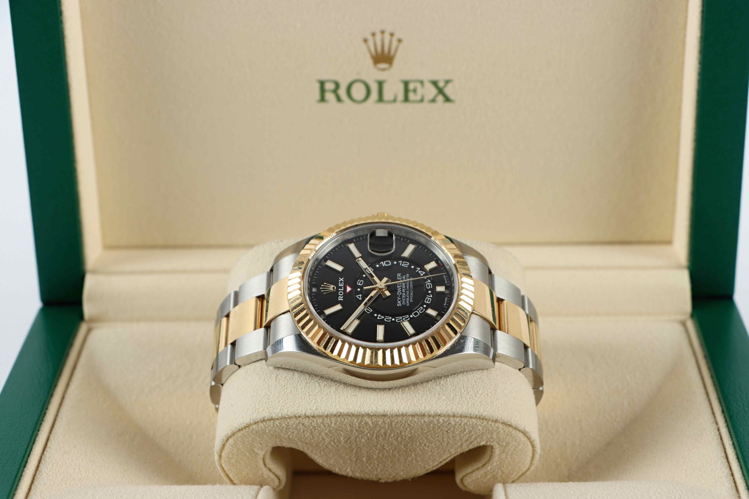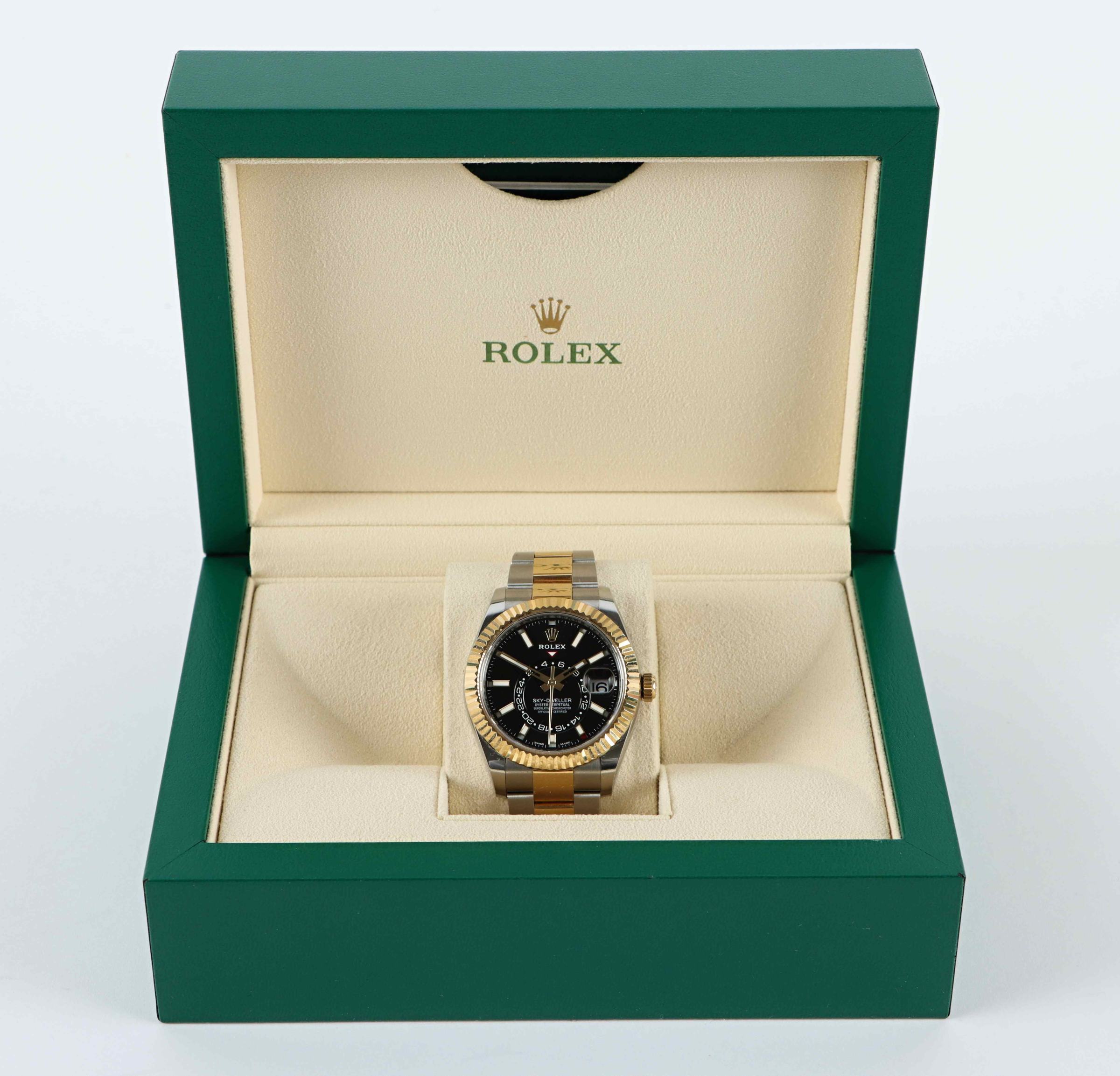 Švýcarsko, Rolex, vyrobeno okolo roku 2021, pánské náramkové hodinky Rolex Sky-Dweller, automat, průměr hodinek 42 mm, pouzdro i tah vyrobeno ze zlata a oceli, černý číselník, safírové sklo, roční kalendář Saros rozlišující měsíce s 30 a 31 dny a systémem Ring Command, díky nimž zobrazuje souběžně dvě časová pásma, jakož i den a měsíc, a umožňuje nařízení těchto funkcí jediným prostým pohybem, velmi dobrý stav, viz foto, funkční, přiložena původní krabice a papíry.