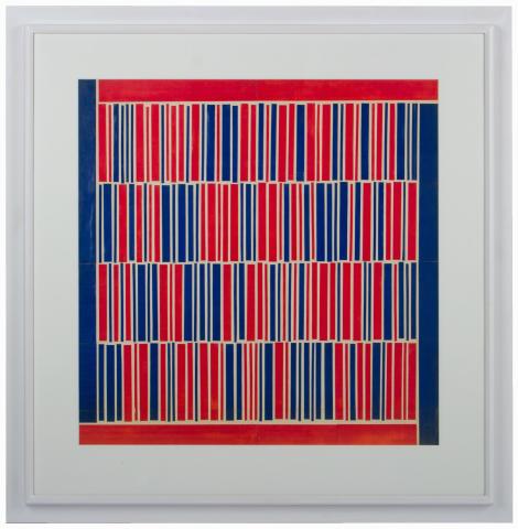 Červeno-modré pruhy, okolo roku 1966, koláž na papíře, značeno razítkem R. Kratina, rozměry 69 x 67,5 cm, celkové rozměry s rámem 98 x 96,5 cm.