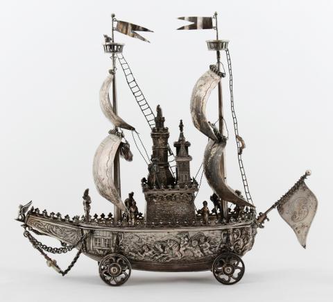 Stříbrný model lodi s figurální výzdobou