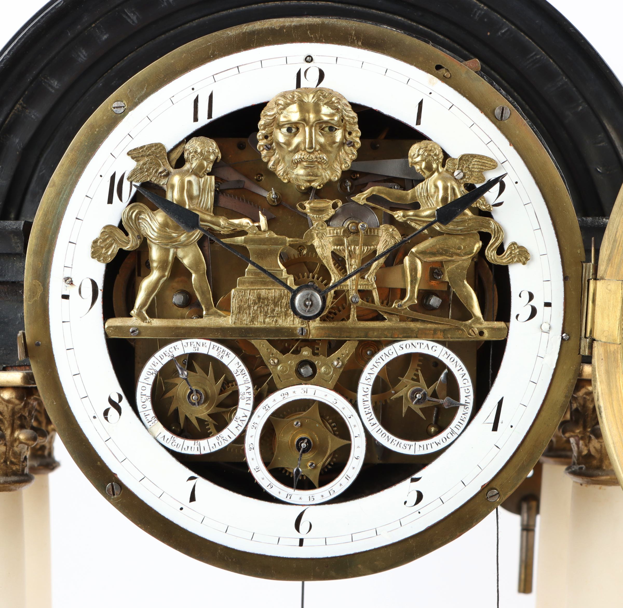 Austria, probably Vienna, 1820s–1830s, veneered ebonized wooden case, four alabaster columns; carved gilded column bases, movement with anchor escapement and pendulum suspended on a silk thread, skeleton dial with an aperture revealing the striking mechanism and calendar gearing, three small dial rings subsidiary ring dials indicating calendar data (month, day of the month, and day of the week), dial with automata – two moving relief figures with an anvil and treadle grindstone (Blacksmith and Grinder), eye turner - a mascaron placed at the top, whose eyes move with the movement of a pendulum, 4/4 hour striking mechanism, repeater function, enamel dial ring with Arabic numerals, blued steel hands, overall dimensions 67 × 34.5 × 15 cm.
