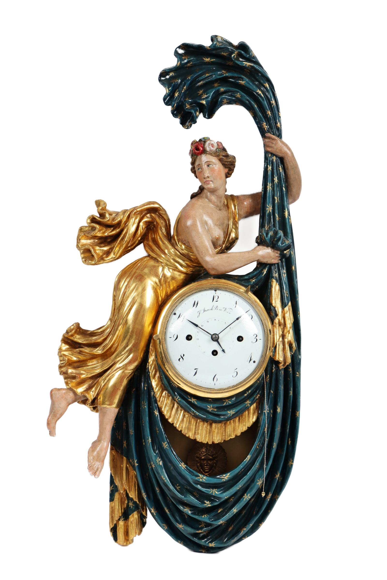 Austria, Vienna, around 1800, cartel clock with a figure of the goddess of dawn – Aurora, very rare and highly collectible wall clock from the workshop of the prominent Viennese clockmaker and academic sculptor Josef Straub (1756–1836), polychrome gilt wood, anchor escapement, Viennese grande sonnerie, repeater on the bells, white enamel dial signed J. Straub B in Wien, overall dimensions 78 × 37 × 16 cm.