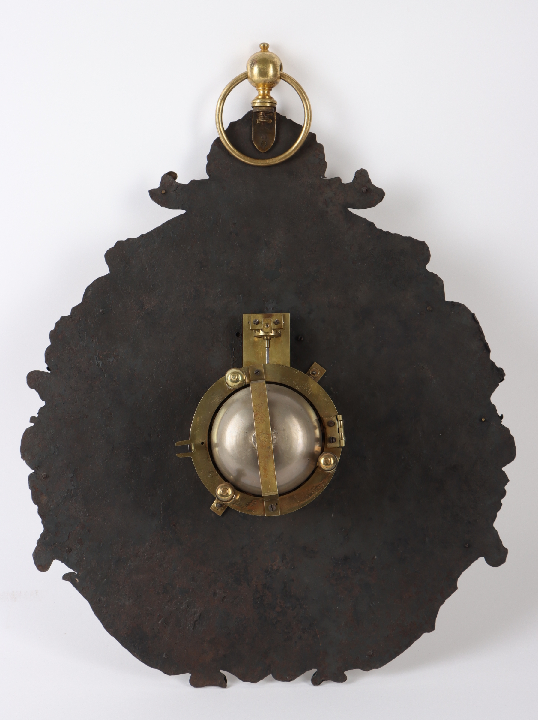 Austria, Vienna, early 18th century, large wall plate clock, wrought-iron dial plate fitted with silvered brass sheet richly decorated in relief, brass dial with Roman numerals and minute divisions with Arabic numerals, movement with spring drive and striking mechanism that strikes the full hours on a metal bell, verge escapement with pendulum oscillator positioned in front of the dial, the oscillator rigidly connected to the pallet arbor, pierced hands of brass and steel, rear movement backplate engraved and signed Mathias Kerkhamer Fecit Vienna, the movement housed in a brass case with three turned feet, overall dimensions of the clock 54 × 38 × 10 cm.